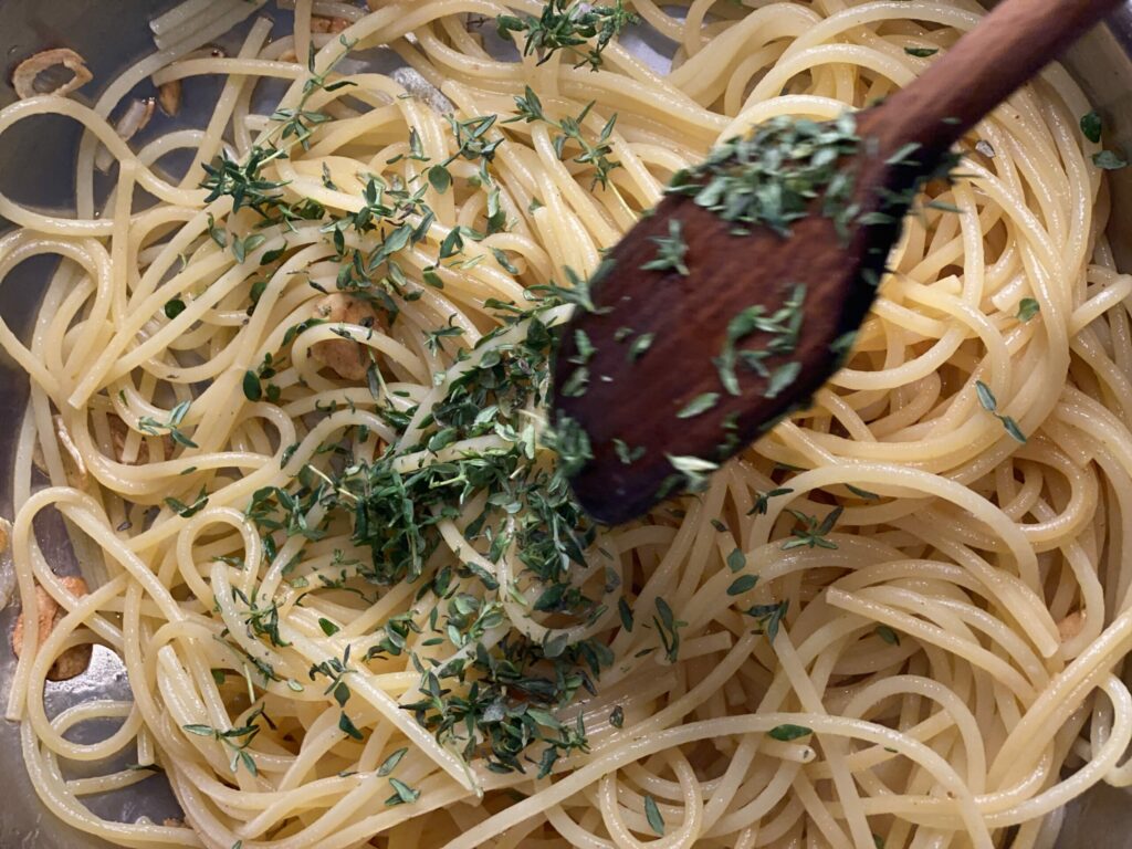 - Nach Ende der Garzeit der Spaghetti diese abtropfen und dann zum Knoblauch in die Pfanne mit dem Speckfett geben. Kräftig darin wenden und die Thymianblätter dazu geben. Anschließend die italienischen Nudeln vorsichtig unter die Eimasse ziehen. Wenn die Nudeln zu heiß sind, kann das Ei stocken. Um dies zu vermeiden, behutsam vorgehen und die Nudeln nach und nach unterziehen. Zu guter Letzt die knusprigen Speckwürfel aufstreuen und eine kräftige Prise frisch gemahlenen Pfeffer drüber geben. Nach belieben mit dem restlichen Parmesan bestreuen und sofort genießen.
