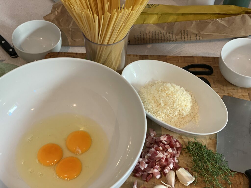 Kleiner Tipp: Damit die Spaghetti nicht so leicht kalt werden, schließlich wird die Eiersoße nicht erhitzt, sollte man die Teller vorheizen und die Eier lange vor der Zubereitung aus dem Kühlschrank nehmen, damit sie Raumtemperatur annehmen können. Ich stelle auch gerne die Schüssel, in der ich die Spaghetti mit der Soße später mische, auch für einige Zeit in die Wärmeschublade oder den Ofen (bei ca. 40 Grad).