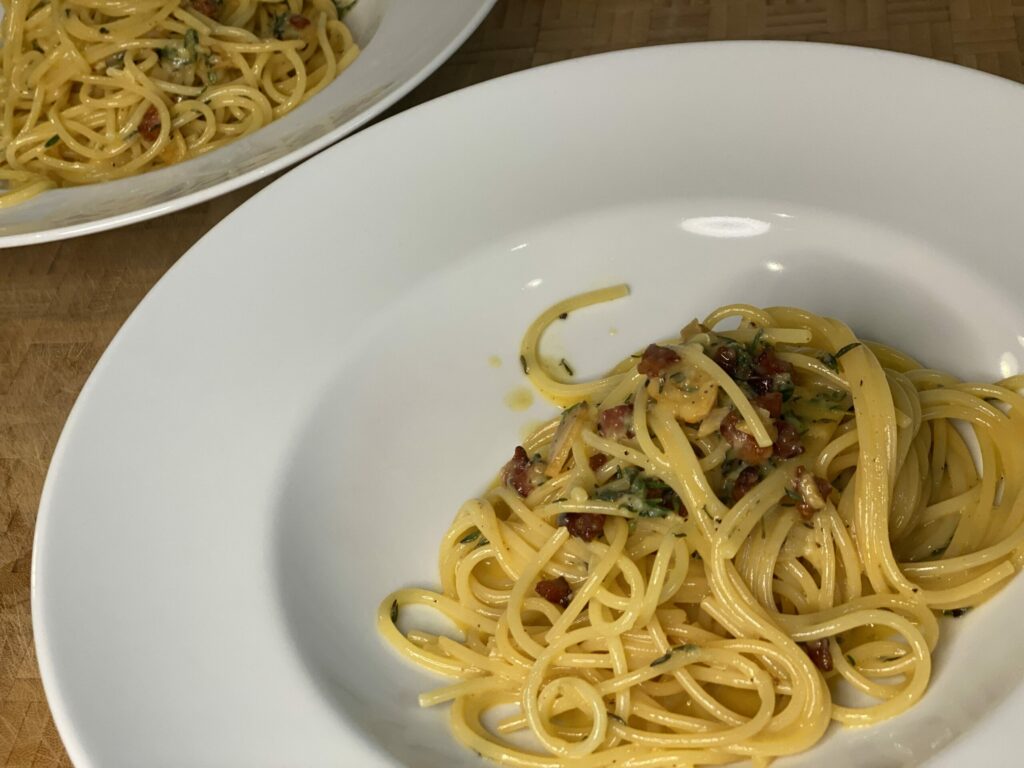Bei diesem traditionellen und altbekannten Gericht aus der Region Latium handelt es sich um eine Eiersoße mit Guanicale oder Pancetta, besser bekannt unter dem Namen Spaghetti alla Carbonara. Ein wirklich wunderbares Gericht, wenn es richtig zubereitet ist. Leider kommt es aber immer wieder vor, dass man sich auf eine wunderbar cremige Eiersoße freut und stattdessen eine Sahnepampe mit „gekochten Schinkenstücken“, bekommt. Sowas hat nichts mit dem Original zu tun und sollte unberührt direkt wieder zurückgegeben werden. Dies ist übrigens einer der Gründe, warum ich Spaghetti Carbonara kaum in einem Restaurant bestelle, aus Angst, von der Zubereitung enttäuscht zu werden.