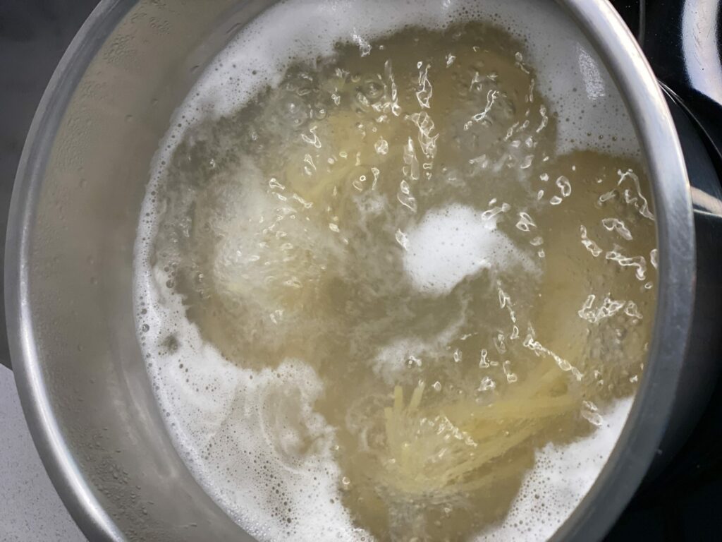 - In der Zwischenzeit sollte das Nudelwasser kochen. Die Spaghetti in reichlich Salzwasser ca. 8 Minuten bissfest garen.