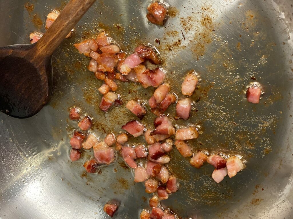 - Zuerst das Nudelwasser aufsetzen und während es aufheizt den Speck in einer Pfanne kross anbraten. Sobald das erste Fett austritt die Hitze reduzieren und die Speckwürfel im eigenen Fett ca. 20 Minuten konfieren. Anschließend die Speckwürfel aus der Pfanne nehmen und beiseite stellen und am besten warmhalten.